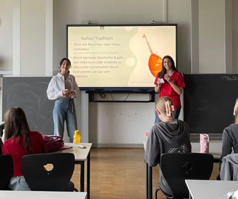 Ein vielsprachiges „Hallo!“ erklang am letzten Schultag vor den Pfingstferien in den Klassenzimmern der siebten Klassen des JEG. Dieser Tag stand ganz im Zeichen von Kultur und Sprache. Einige Schülerinnen und Schüler stellten ihren jeweiligen Klassen kulturelle Besonderheiten ihrer Herkunftsländer vor: Traditionelle Kleidung, Sitten und Bräuche, besondere Feste, Musik und Kulinarisches aus Bulgarien, China, Ecuador, Irak, Jordanien, Paraguay, Peru, Rumänien, Syrien und der Türkei bildeten den Mittelpunkt des Kultur- und Fremdsprachentages, an dem das Publikum auch in die jeweiligen Landessprachen hineinschnuppern konnte. Bisher unbekannte diakritische Zeichen, exotische Buchstaben, geheimnisvolle Schriftzeichen, aber auch ungehörte Laute wurden den Schülerinnen und Schülern vorgestellt. So konnten sie sich an Fremdsprachen, die nicht zum schulischen Alltag gehören, ausprobieren. Auch einige Lehrkräfte mit Auslandserfahrung und Schülerinnen und Schüler aus höheren Jahrgangsstufen trugen mit ihrem Einsatz zum Erfolg der Veranstaltung bei. Die Siebtklässler waren aber keine passiven Zuschauer und Zuhörer, ganz im Gegenteil, denn nicht nur im Bereich Sprachen war learning by doing angesagt, es wurde u. a. halay und cumbia getanzt, tawla gespielt und dank des tatkräftigen Einsatzes von Eltern auch gut und üppig gegessen.