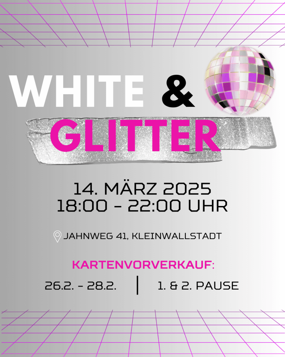 Am 14.3.2025 ist es nun endlich wieder soweit. Unter dem Motto „White & Glitter“ laden wir die Schulfamilie ab der 7. Klasse herzlich zur zweiten SMV Party ein. Passend zum Motto können sich die Schülerinnen und Schüler kreativ entfalten – sei es durch funkelnde Accessoires, glitzernde Outfits oder passende Schminke. Ein DJ wird mit passender Musik für ausgelassene Tanzmomente sorgen und kleine von der SMV vorbereitete Überraschungen runden den Abend ab.