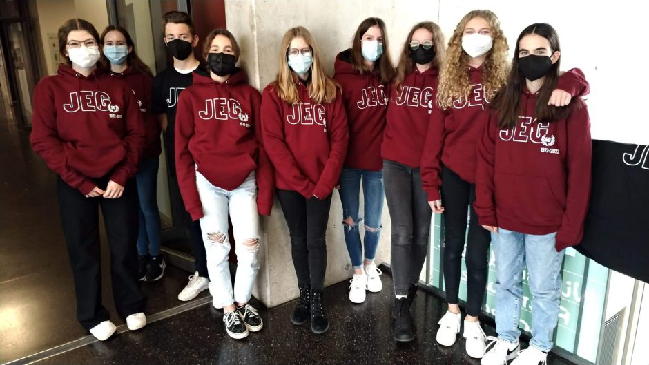 Wer mit offenen Augen durch unser Schulhaus läuft, dem dürfte nicht entgangen sein, dass seit vergangener Woche auffällig viele Schülerinnen und Schüler mit dunkelroten Kapuzenpullis unterwegs sind. Und wer noch genauer hinschaut, stellt fest, dass auf jedem Kleidungsstück das Kürzel „JEG“ zu finden ist.