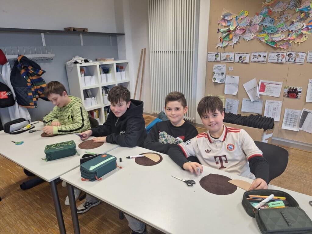 Nun hieß es: Incipiamus! („Los geht`s!“) An zwei Infostationen erhielten die Schülerinnen und Schüler einen ersten Einblick in das Fach Latein, an zwei Mitmachstationen konnten sie selbst aktiv werden. Begleitet wurden sie dabei von den Lateinlehrkräften und den Tutoren, an die an dieser Stelle ein herzliches Dankeschön ergeht: Gratiam vobis agimus! An der ersten Station bastelten die Kinder eine römische Rundmühle aus Leder und probierten das beliebte Kinderspiel der Antike direkt aus, was problemlos gelang, da es sich dabei um eine vereinfachte Version unseres heutigen Mühlespiels handelt. Die Rundmühle durften sie dann samt der zugehörigen Spielsteine als praktisches, verschnürbares Ledersäckchen mit nach Hause nehmen. Bei der nächsten Station wurden die Schülerinnen und Schüler vom Lateinhasen Julius begrüßt, der die Hilfe der Kinder benötigte. Sie mussten Produkte, die uns täglich beim Einkaufen begegnen, den ihnen zugrunde liegenden lateinischen Wörtern zuordnen. Auch dies meisterten die Kinder mühelos und so erfuhren sie auf anschauliche Weise, dass Latein in unserem Alltag allgegenwärtig und keineswegs tot ist: Lingua Latina mortua non est! Bei einer weiteren Station erhielten sie einen ansprechenden Infoflyer zur Sprache Latein, in dem sie mehrere Rätsel lösen durften. Dadurch wurde ihnen bewusst, dass Latein die Grundlage vieler moderner Fremdsprachen darstellt, zahlreiche Parallelen zur deutschen Sprache aufweist und in der Fachsprache wichtiger Berufe erscheint. An der letzten Station standen römische Spiele auf dem Programm, z.B. mussten beim Delta-Spiel Nüsse möglichst in die Spitze eines auf den Boden gemalten Dreiecks geworfen werden oder beim Pentelitha-Spiel Knöchelchen hochgeworfen und mit dem Handrücken wieder aufgefangen werden.