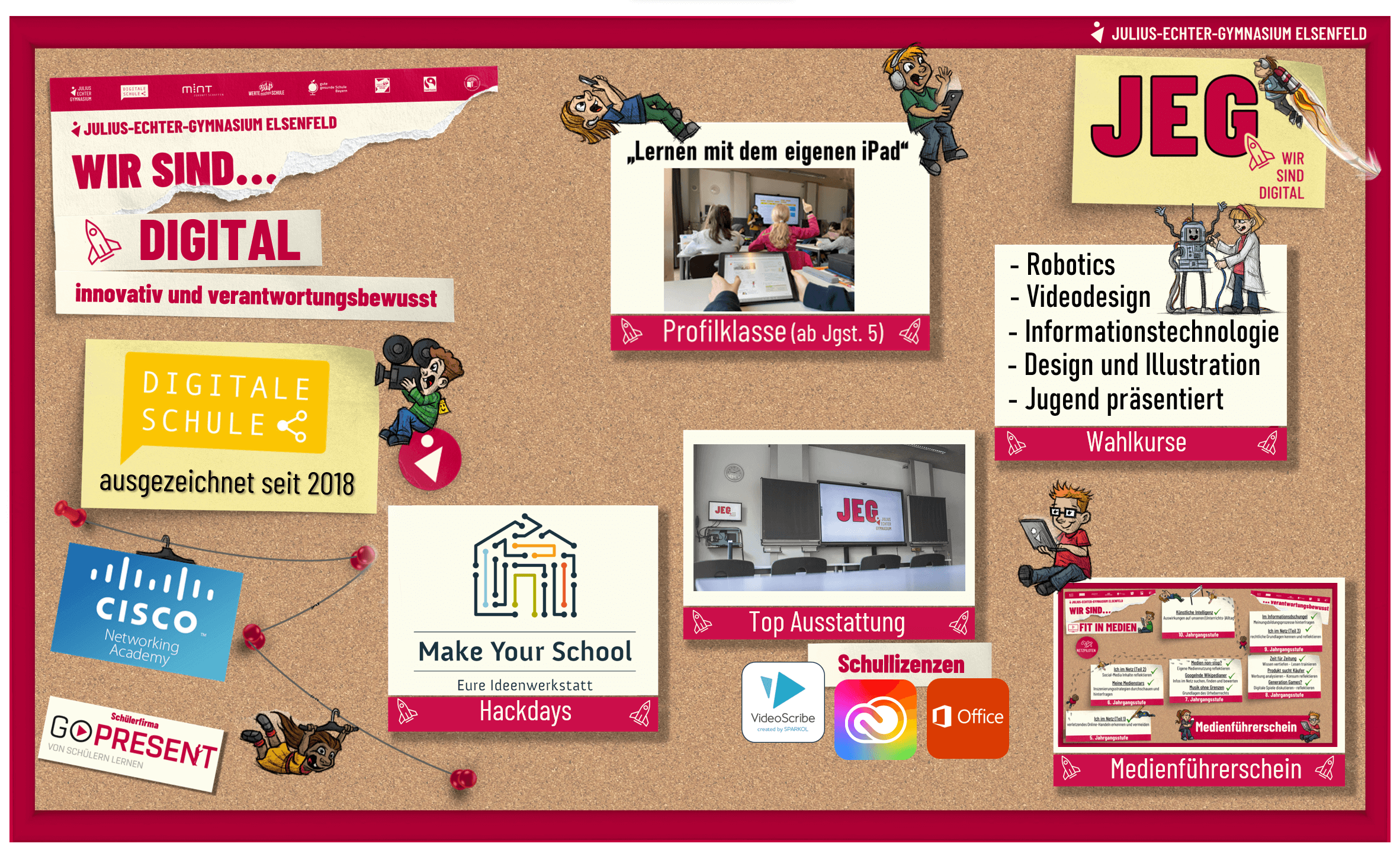 Da die Digitalisierung aber auch viele Gefahren birgt, ist uns die Vermittlung eines achtsamen Umgangs mit den digitalen Medien sehr wichtig. Dies wird im Rahmen des Medienführerscheins am JEG über mehrere Jahrgangsstufen hinweg umgesetzt. Weitere Informationen sind unter folgendem Link aufgeführt.