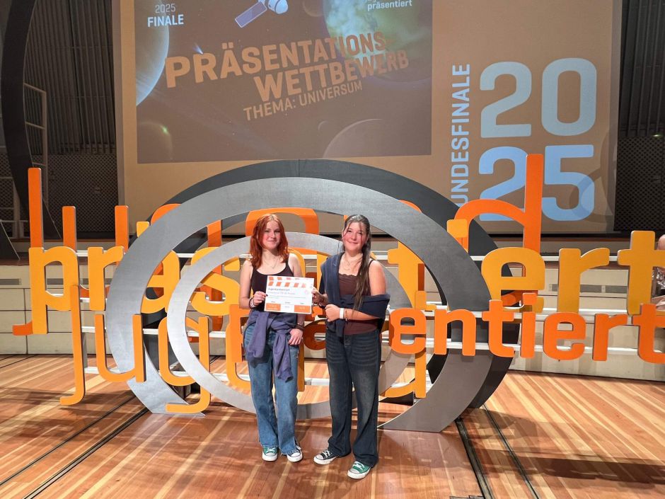 Mit ihrer Präsentation „Der Blick ins Universum – ein faszinierendes Farbenspiel: Warum erscheint uns der Himmel je nach Tageszeit und Ort in unterschiedlichen Farben?“ begeisterten Maria und Greta Jury und Publikum gleichermaßen – und sicherten sich einen Platz unter den Top 20 Deutschlands!