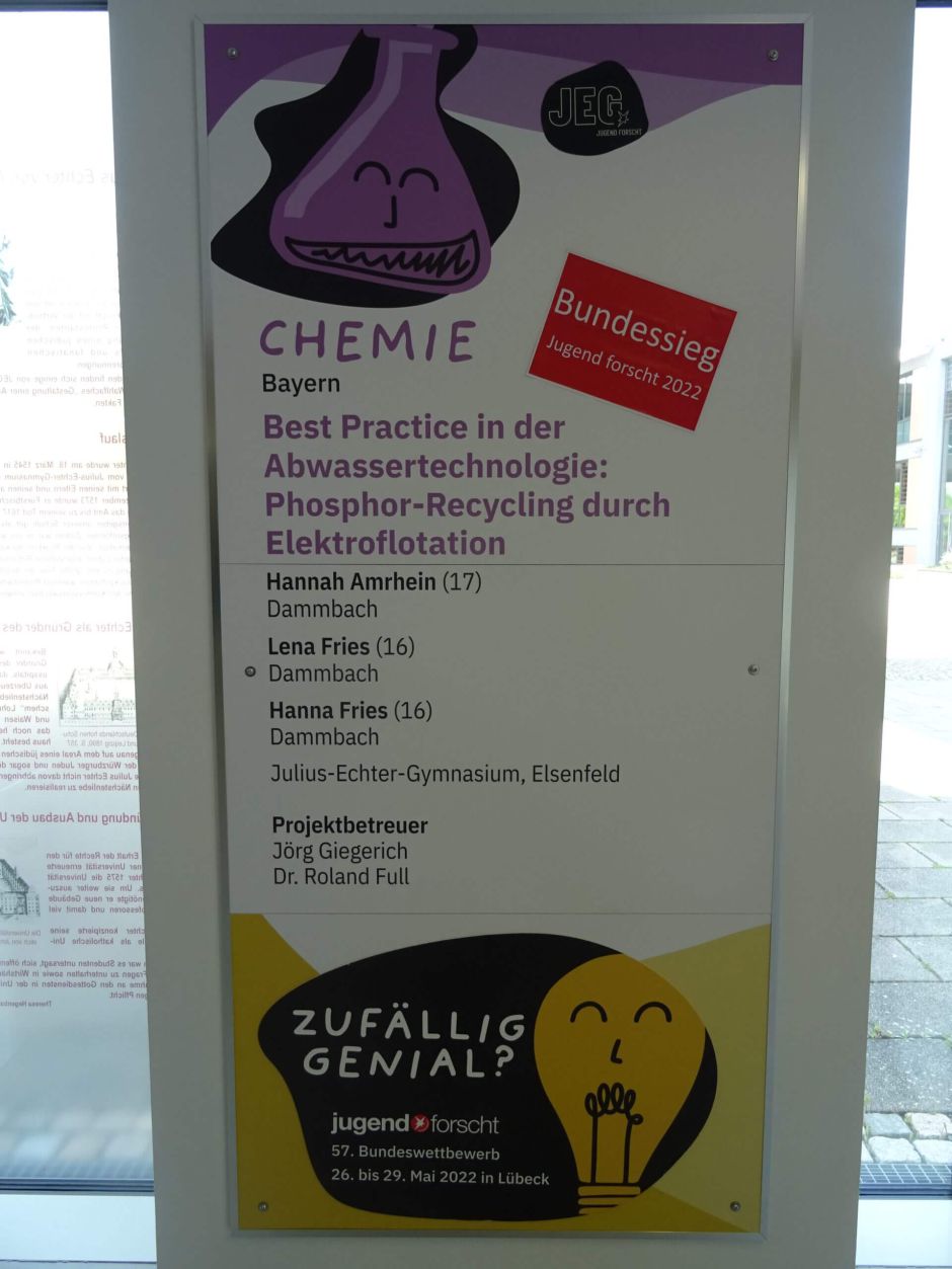 Feierstunde am JEG! Grund dafür waren nicht die anstehenden Pfingstferien, sondern der grandiose Erfolg der Schülerinnen Hannah Amrhein, Lena und Hanna Fries (10 C), die am vergangenen Sonntag beim Bundesfinale des Wettbewerbs „Jugend forscht“ mit ihrem Beitrag aus dem Fachbereich Chemie „Best Practice in der Abwassertechnologie: Phosphor-RecycIing durch Elektroflotation“ den ersten Platz errungen hatten. Am 3. Juni stellten sie in der Aula ihre Siegerpräsentation vor.