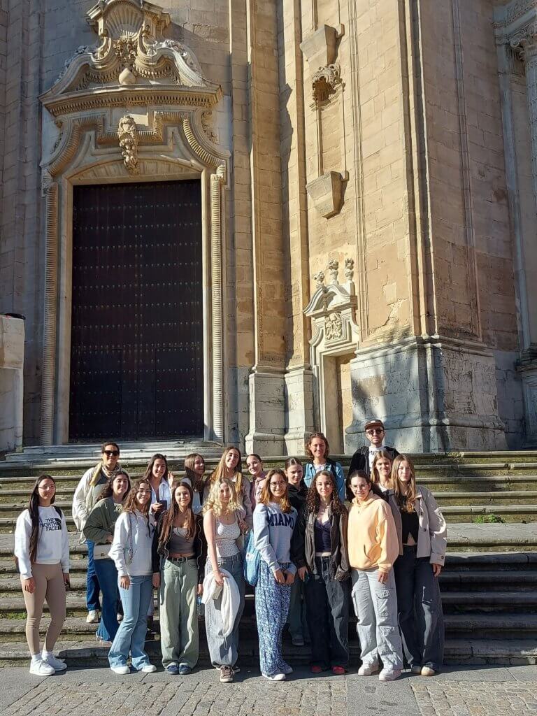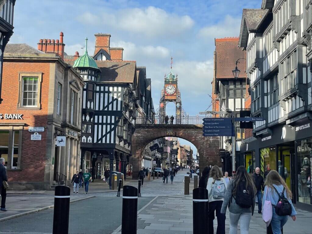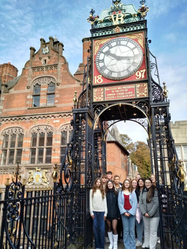 During our exchange we went on a trip to Chester. We travelled by train and arrived in the morning. From the station, we walked past the river to the city centre. The weather was sunny and we all felt excited. Our teachers guided us through the city and told us many interesting facts. First, we walked along the old city wall, which gave us a great view of Chester. Then we visited a large, beautiful church and saw the famous clock tower. We also saw the ruins of a Roman amphitheatre and looked at an old Roman sauna/bath. Later, we went to the oldest horse racing track in the world, that is still active. It was very interesting to see how old and historical the city is. After our walk, the teachers allowed us to have some free time. We walked through the streets and visited some small shops. The buildings were old but very beautiful. We liked the mix of historic and modern life and we also took some photos to remember the trip. Everyone had a lot of fun during the day. We learned a lot of new things about Chester and its history. It was a great experience for our whole group. We really had an amazing time in England and the trip to Chester was great.