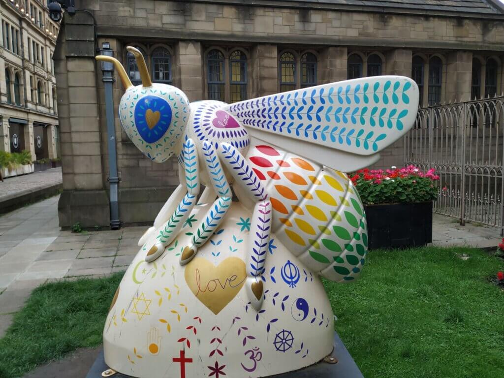 In the afternoon we had some free time and visited a typical English shopping mall with lots of small stores. In our free time we had a little competition: we had to take as many photos of bees as possible. Bees are the landmark of Manchester and since the Industrial Revolution they have been a symbol of a big busy community and the industrial character. You can see them on bins and street lights all over the city.