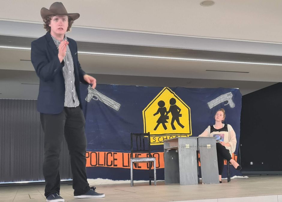 Für die 7., 8. und 9. Jahrgangsstufe gab es dann „Furious Games“, ebenfalls von Kristi-Anne Seth. Dabei handelt es sich um ein Theaterstück über Aggression und Gewalt unter Teenagern. Thematisiert wird das Phänomen der zunehmenden Feindseligkeit in der Gesellschaft. Angesichts von Gewalt an Schulen wird versucht, die Frage zu beantworten, welche Ursachen dafür verantwortlich sind: Computerspiele, Filme, Eltern, die Gesellschaft oder das Bildungssystem? In mehreren Szenen stellten die glänzend agierenden Schauspieler verschiedene archetypische Situationen nach, schlüpften dabei immer wieder in neue Rollen und machten sich auch plötzlich auf, um die Zuschauer in das Geschehen einzubinden. „Das war toll, weil es so nahe war, aber man hatte auch ein bisschen Angst, dass sie einen plötzlich drannnehmen“, so eine Schülerin aus der Klasse 7 B.
