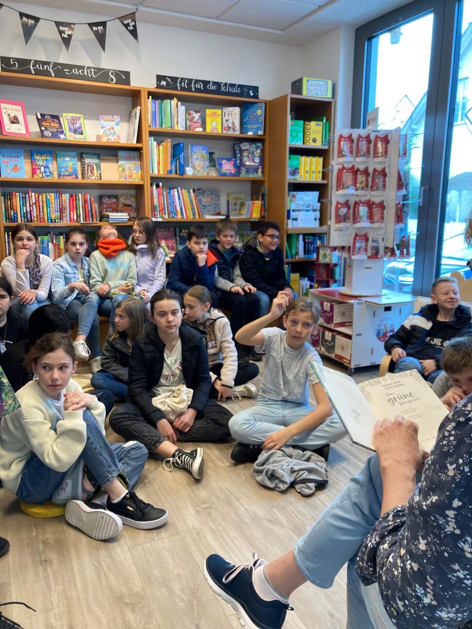 Die 5B hat Dank des Buchhauses in Elsenfeld zum Welttag des Buches für ein paar Momente nicht nur in die sonderbare Welt der Hackebarts eintauchen dürfen. Auch eine kleine Reise in ferne Länder und zu leuchtenden Unterwassergräsern war dank des bebilderten Weltatlasses „Alle Länder dieser Welt“ möglich. Für alle Botanik-Liebhaber folgte zudem ein erster Einblick in Cornelia Funkes Roman „Das grüne Königreich“. Die lebendigen Erzählungen der Buchhändlerin Frau Welzbacher ließ die Protagonistin „Caspia“, die Briefe von einem blinden Mädchen entdeckt und auf diesem Wege die Welt der Pflanzen bereist, zum Leben erwecken.