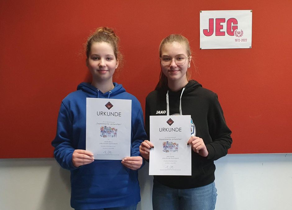 Die eingeschickte Dokumentation der Experimente wurde anschließend von einer Jury bewertet. Aufgrund ihrer sehr guten Leistung wurden die Schülerinnen mit einer Urkunde ausgezeichnet und erhielten zusätzlich kleine Sachpreise als Anerkennung für ihre Forschungsarbeit. Wir freuen uns auf weitere spannende Entdeckungen im Rahmen von „Experimente antworten“.