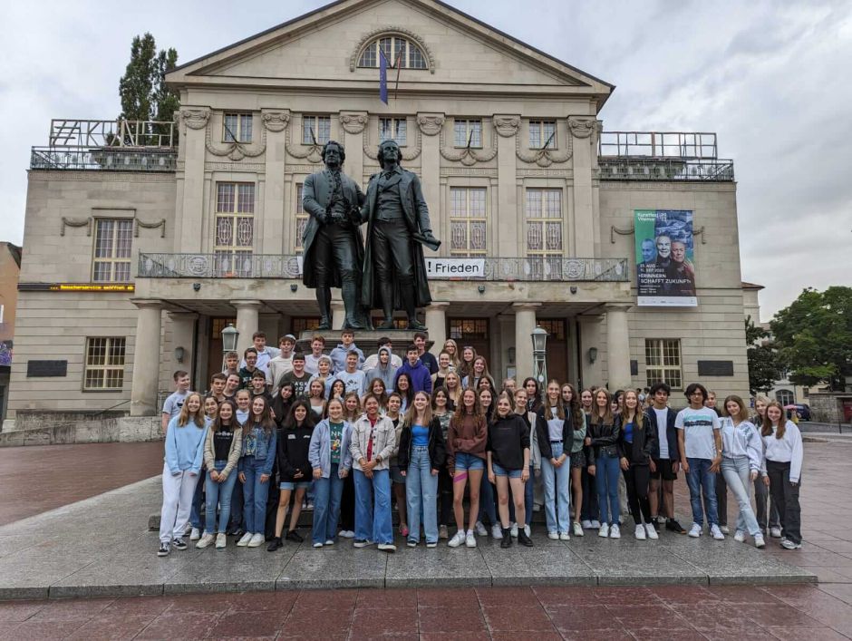 Wie alle Exkursionen musste auch die traditionelle Fahrt der 9. Jahrgangsstufe nach Weimar eine coronabedingte dreijährige Zwangspause einlegen. Dass sie in diesem Jahr vom 19. bis 21. Juli stattfinden konnte, ist deswegen schon eine Erwähnung wert; auch, weil der Lehrplan für das Fach Geschichte der 9. Jahrgangsstufe den Besuch eines Erinnerungsortes an die NS-Diktatur zwingend vorschreibt, die Fahrt also unerlässlicher Bestandteil – nicht nur der gymnasialen – Bildung ist. Außerdem wurde sie zum ersten Mal von Geschichtslehrer Marcel Giloj organisiert und auch durchgeführt, der diese Aufgabe von Joachim Schweizer übernommen hat.