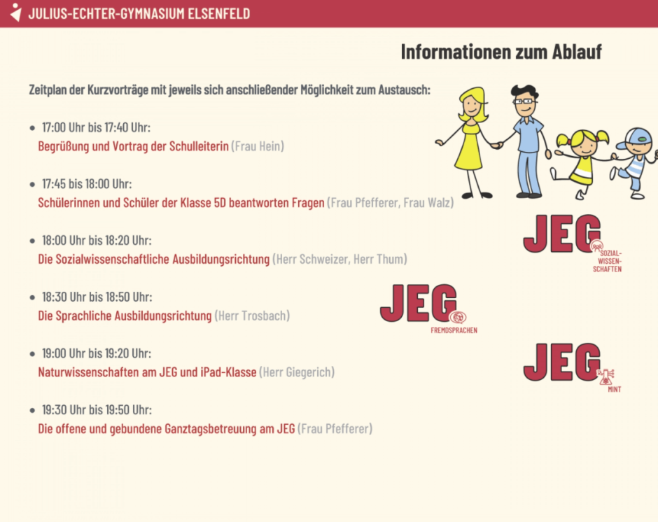 Außerdem können Sie mit Ihren Kindern auf unserer Homepage stöbern, unseren Imagefilm anschauen und gemeinsam den virtuellen Rundgang „gehen“, um das JEG kennenzulernen.