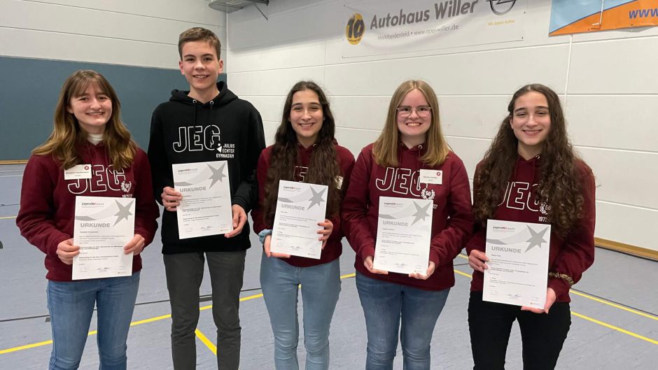 Titelverteidigung🥇🥇. Wie auch schon im letzten Jahr konnten unsere beiden Jugend forscht Teams unter der Leitung von Dr. Roland Full die Jury beim Regionalfinale überzeugen und sich als Sieger für das Landesfinale Bayern qualifizieren. In der Altersgruppe Jugend forscht belegten Lena und Hanna Fries und Hannah Amrhein den 1. Platz im Fachbereich Chemie mit ihrer Arbeit über Fotokatalyse von Wirkstoff Hypericin aus Johanniskraut. Elisabeth Fischermann und Tom Kreßbach holten sich den Sieg im Regionalfinale mit der Auszeichnung „Bestes interdisziplinäres Projekt“. In ihrer Arbeit untersuchten sie sie CO2 Speicherung von Meerwasser unter Laborbedingungen.