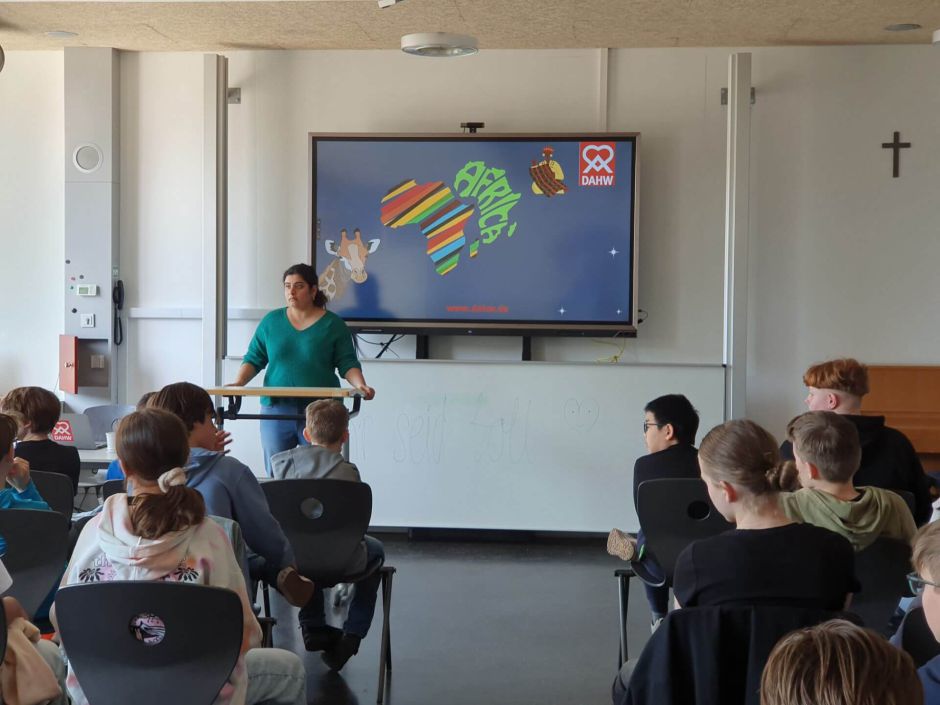 Anhand dieses Projekts und vieler Bilder von ihrem Aufenthalt in Tansania bringt Frau Amembal den Schülerinnen und Schülern das Leben der Kinder in Tansania näher und vermittelt ihnen im Verlauf von eineinhalb Stunden ein anschauliches Bild von ihrer Lebensfreude, aber auch ihren Bedürfnissen und Wünschen, die doch teils sehr verschieden sind, wenn die Kinder in Ostafrika sich nicht einen Fußballplatz wünschen, sondern für uns so Selbstverständliches wie Trinkwasser in der Schule.