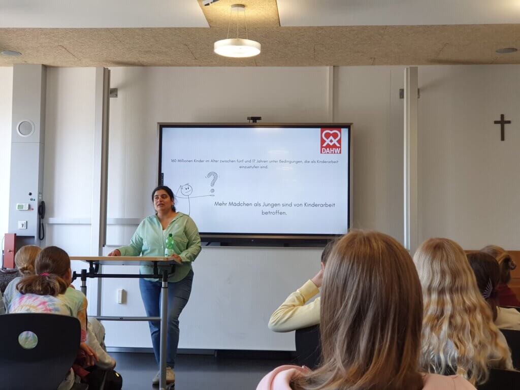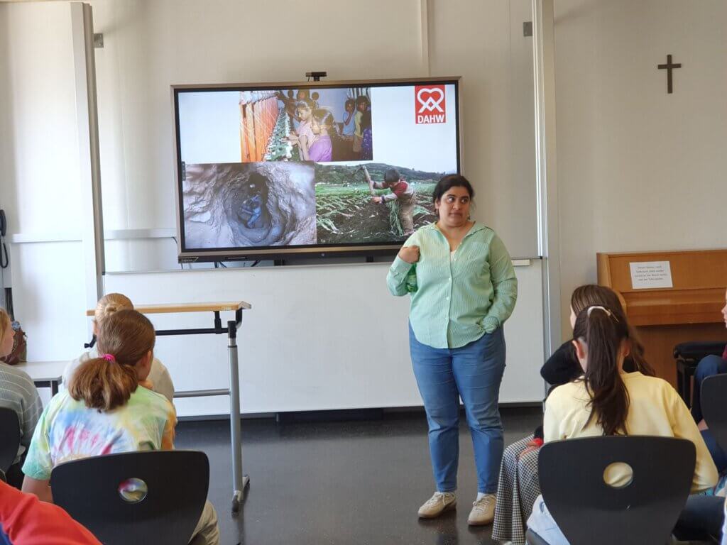 Was bedeutet Armut? Warum müssen Kinder arbeiten? Haben Kinder Rechte? Diese Fragen stellt Saanika Amembal vom DAHW (Deutsche Lepra- und Tuberkulosehilfe) in Würzburg den Schülerinnen und Schülern der 6. Klasse im Rahmen ihres Vortrags über Kinder der Einen Welt.