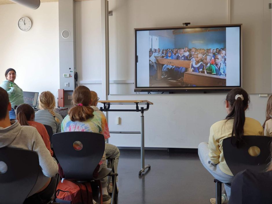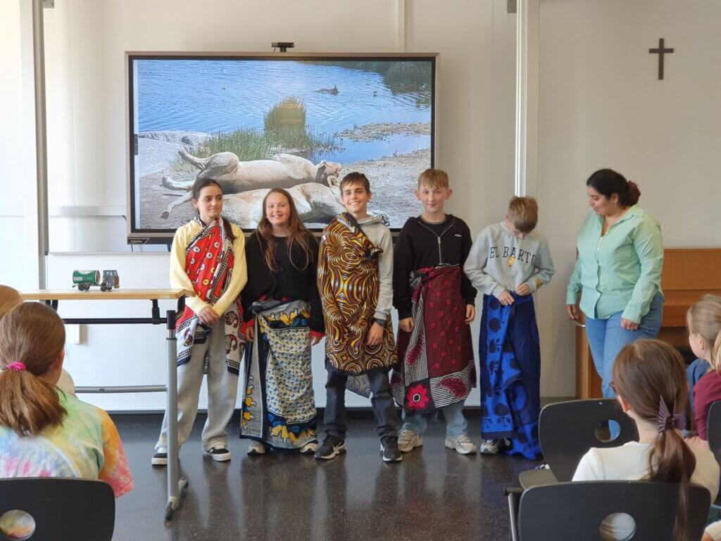 Frau Amembal bringt den Schülerinnen und Schülern das Leben der Kinder in Tansania näher und vermittelt ihnen im Verlauf von eineinhalb Stunden ein anschauliches Bild von ihrer Lebensfreude, aber auch von ihren Bedürfnissen. Verstärkt wird der Eindruck durch erlebnisorientierte Elemente. So werden Rasseln mit Kürbiskernen und Obstkernen ausprobiert und einige Schülerinnen und Schüler dürfen sogar einen der wunderschönen traditionellen afrikanischen Kangas mit Sinnsprüchen anprobieren.