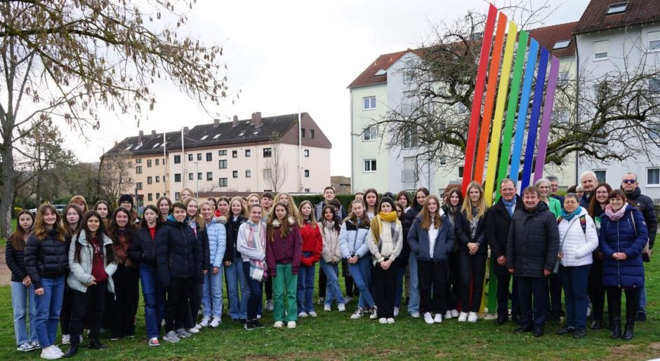 Petra Hein, Schulleiterin des JEG, hieß am 27. März die Jugendlichen aus der Normandie sowie ihre begleitenden Lehrkräfte, Frau Baudry sowie Frau Jahier, herzlich am JEG willkommen und wünschte ihnen für die anstehende Woche viele interessante neue interkulturelle Erfahrungen. Gleich am ersten Tag ging es nach Kleinwallstadt, die Partnergemeinde von Saint-Pierre-en-Auge, da die Marktgemeinde und der Freundeskreis eine Veranstaltung in der Zehntscheune organisiert hatten, um Erwin Dotzel, Bezirkstagspräsident auf Abschiedstournee, und eine Delegation des Bezirks Unterfranken willkommen zu heißen. Thomas Köhler, Bürgermeister von Kleinwallstadt, und Thomas Pfeifer, Vorsitzender des Freundeskreises Kleinwallstadt – Saint-Pierre-en-Auge, hoben – wie auch der Bezirkstagspräsident in seiner Rede – die Bedeutung der Jugend für die Lebendigkeit der deutsch-französischen Beziehungen hervor, und überreichten den beteiligten Lehrkräften auf deutscher Seite als sehr willkommene Überraschung einen Scheck als finanzielle Unterstützung der Austauschmaßnahme. Ein gemeinsames Foto auf dem Saint-Pierre-Platz beim mit der französischen Partnergemeinde errichteten Regenbogenmonument setzte den Schlusspunkt einer gelungenen Veranstaltung; anschließend nahmen die französischen Jugendlichen noch am Unterricht ihrer deutschen Partner teil.