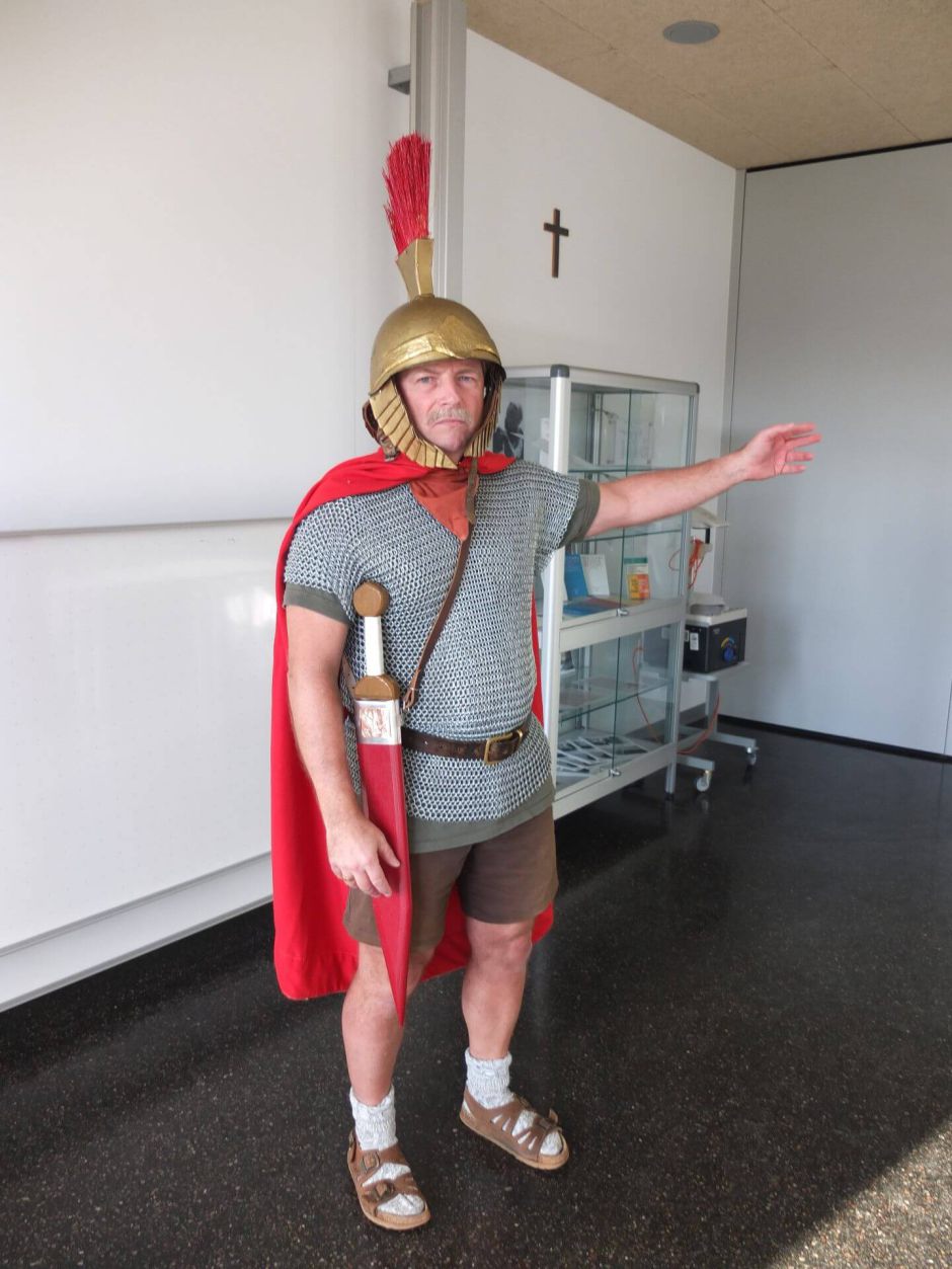 Im ersten Teil der Veranstaltung bastelten die Kinder eine römische Rundmühle, die sie dann samt der zugehörigen Spielsteine als praktisches, verschnürbares Ledersäckchen mit nach Hause nehmen konnten; danach standen römische Spiele (z.B. das Orca-Spiel, bei dem Nüsse geworfen wurden), ein Memory und Bewegungsspiele auf dem Programm. Außerdem bekamen die sichtlich beeindruckten Kinder Informationen aus erster Hand über das Leben der Römer in Germanien und am Limes (z.B. im Kastell Nemaninga) vom „praefectus cohortis“ persönlich präsentiert. Ganz herzlichen Dank an Herrn Joachim Oberle, Vorsitzender des JEG-Freundeskreises und 2. Vorsitzender des Geschichtsvereins Elsenfeld, dafür, dass er sich die Zeit genommen hat, den Schülerinnen und Schülern, die mucksmäuschenstill waren, die Welt der Römer nahezubringen! Herr Oberle erschien als „legionarius“ in voller Ausrüstung , erzählte den Kindern viel Wissenswertes zum Fach Latein und übte schon mal erste lateinische Deklinationsformen und Sätzchen mit ihnen ein. Magnam gratiam ei agimus!