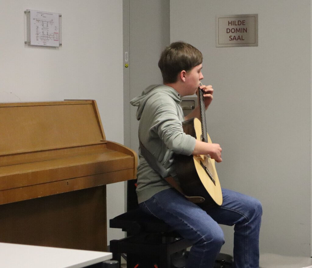 Zwei musikalische Beiträge, von Jona Brand einfühlsam gespielt, unterstrichen die Stimmung der Lesungen. Viel Applaus bekam Lea Bachmann für ihren Poetry-Slam-Text „Waffen schweigen – Worte nicht, in dem sie an die politische Verantwortung gemahnte, die mit dem Gedenktag einhergehe, denn „80 Jahre Frieden sind kein Besitz, keine Garantie, sie sind ein Versprechen“, so Bachmann.