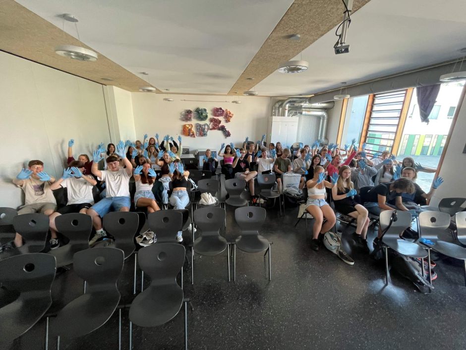 Theoretisch und auch ganz praktisch vorbereitet auf ihren Einsatz wurden die Schülerinnen und Schüler in der vorletzten Schulwoche durch die Caritas-Sozialstation St. Johannes e.V. in Erlenbach unter Leitung von Susanne König. Auch hier hieß es, statt das Schuljahr entspannt ausklingen zu lassen, noch einmal anstrengen und anpacken. Begleitet durch vielerlei praktische Übungen erlernten die Jugendlichen im Laufe der sogenannten „Woche der Pflege“ die Grundlagen der Hygiene und Desinfektion, der Lagerung und Mobilisierung, der Messung der Vitalfunktionen und die Basics zu Beschäftigung und Nahrungsaufnahme. Sie übten mit Rollstühlen und Rollatoren und begeisterten sich für Pflegeroboter Pepper, der eine muntere Diskussion über die Chancen der Digitalisierung in der Pflege begleitete. Sensiblere Themen wie Demenz, Organspende und generell die Würde der Pflegebedürftigen lösten nachdenkliche Gespräche aus. Die Erfahrung und Authentizität der Pflegekräfte ermöglichte aus Sicht der Schülerinnen und Schüler eine intensive Auseinandersetzung mit theoretischen, praktischen und gesellschaftspolitischen Themenfeldern der Pflege sowie eine sinnvolle Vorbereitung auf das Praktikum, das im Gegensatz zu ihrem Tag im Kindergarten in der Jahrgangsstufe 9 nun den Blick vom hilfsbedürftigen Kind zum hilfsbedürftigen Menschen im Alter lenkt.