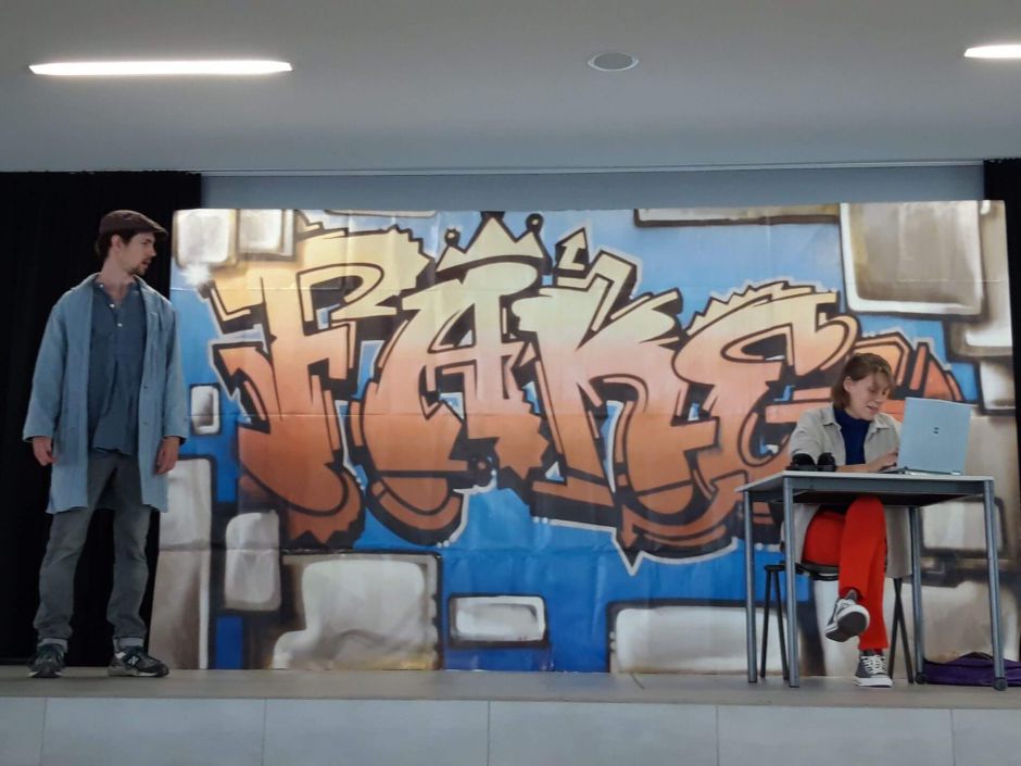 Erster Schultag nach den Ferien und in der 3.+4. Stunde schon etwas Besonderes für die 6er und 7er. „Fake oder War doch nur Spaß“ des Theaterensembles Radiks aus Berlin, ein Stück von Karl Koch, wurde am Montag, den 12.6., als Baustein des Medienführerscheins in unserer Aula aufgeführt.