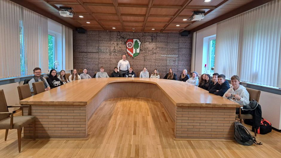 Wir, der sozialwissenschaftliche Zweig der Klasse 9D, haben am 24.04.2024 mit unserem Lehrer, Herrn Fischer, das Rathaus in Elsenfeld besucht. Dort durften wir im Sitzungssaal den Bürgermeister Kai Hohmann kennenlernen, welcher viele unserer Fragen beantwortet hat. So berichtete uns Herr Hohmann zum Beispiel, dass man auch als Bürgermeister zunehmend mit Hass und Hetze im Internet konfrontiert wird. Man bräuchte daher ein „dickes Fell“. Aber gleichzeitig betonte er auch, dass es deutlich mehr positive Rückmeldungen aus der Bevölkerung gibt.