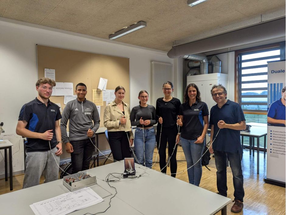 Die Veranstaltung war so organisiert, dass die Schülerinnen und Schüler sich im Vorfeld für drei Vorträge entscheiden konnten, die sie am meisten ansprachen. Diese Auswahlmöglichkeit ermöglichte es ihnen, sich gezielt mit den Berufen zu beschäftigen, die sie wirklich interessierten. Zur Auswahl stand eine sehr große Bandbreite an Tätigkeiten: von Bürotätigkeiten wie der Steuerberatung bei con.tax, der Arbeit bei der AOK oder der Sparkasse über technische Berufe bei der WIKA bis hin zu sicherheitsrelevanten Berufen wie dem des Polizisten oder der Tätigkeit bei der Bundeswehr. Eine Überraschung im Gepäck hatten Frau Busch und Herr Büttner, welche die Firma WIKA vertraten: Im Rahmen der Berufsorientierung übergaben sie eine Sieben-Segment-Anzeige an die Fachschaft Physik. Super!