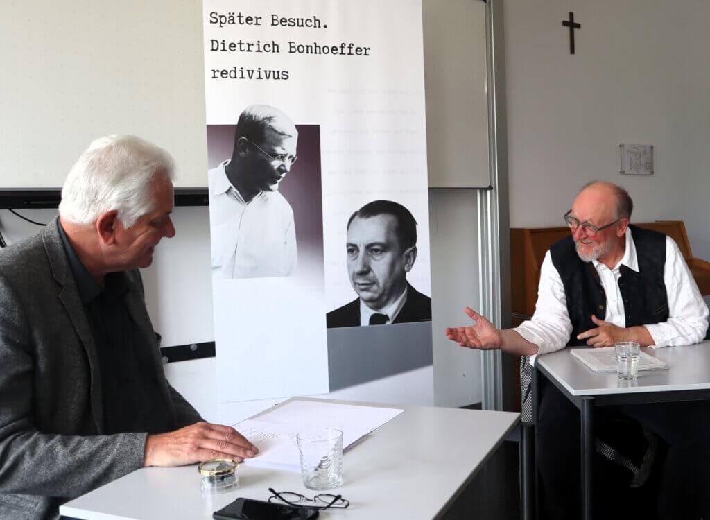 An das Ende des Zweiten Weltkriegs am 8. Mai vor genau 80 Jahren wurde am Julius-Echter-Gymnasium in besonderer Weise erinnert. Am Vormittag kamen der bekannte Autor Bernhard Setzwein und der Kulturjournalist Stefan Voit an die Schule, um vor den Schülerinnen und Schülern der 11. Jahrgangsstufe Setzweins Stück „Später Besuch. Dietrich Bonhoeffer redivivus“ in einer szenischen Lesung aufzuführen.