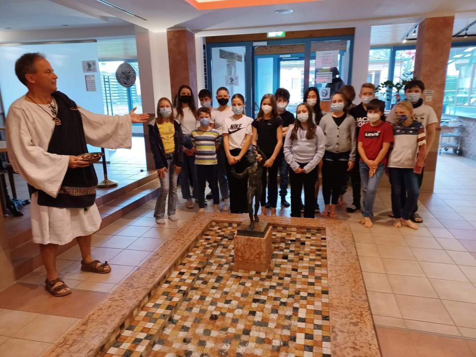 Diesem Aufruf zum Besuch römischer Bäder kamen die LateinschülerInnen der 6. Jahrgangsstufe des Julius-Echter-Gymnasiums Elsenfeld nur allzu gerne nach und folgten Ihren Lehrerinnen Frau Braun und Frau Ebert im Rahmen einer kleinen Exkursion in die Römerbäder des Elsavamar. Die Überraschung hätte wohl nicht größer sein können, als sie dort von Herrn Joachim Oberle, dem Vorsitzenden des Freundeskreises des JEG, in der Gestalt des Lucius Petronius Florentinus willkommen geheißen wurden. Denn wer wäre besser geeignet, den SchülerInnen von römischen Kastellen am Limes, sagenumwobenen Kämpfen zwischen Römern und Germanen oder der schicksalhaften Varusschlacht zu berichten, als dieser Praefectus cohortis von Nemaninga, der das antike Obernburg bestens gekannt haben musste? Dass das Leben in einer römischen Grenzstadt wie Nemaninga durchaus seine Vorteile hatte, wird den LateinschülerInnen schnell klar, als der Präfekt ihnen vor der Kulisse der hiesigen Römerbäder die damalige Thermenkultur vorstellt. Umringt von den Büsten großer römischer Kaiser tauchen sie hautnah in die Funktionsweise dieser antiken Wellnessoasen ein, in denen Fußbodenheizung, Massagen und die unterschiedlichsten Warm- und Kaltwasserbecken zum Standard gehörten und den Inbegriff römischer Zivilisation darstellten. Doch „Tempus fugit“ (etwa „Die Zeit rennt“) und so verabschiedeten sich die LateinschülerInnen nach einem äußerst informativen und beeindruckenden Einblick in die römische Lebenswelt beim Präfekten Lucius Petronius Florentinus mit einem herzlichen „Gratiam habemus!“ und „Vale!“.