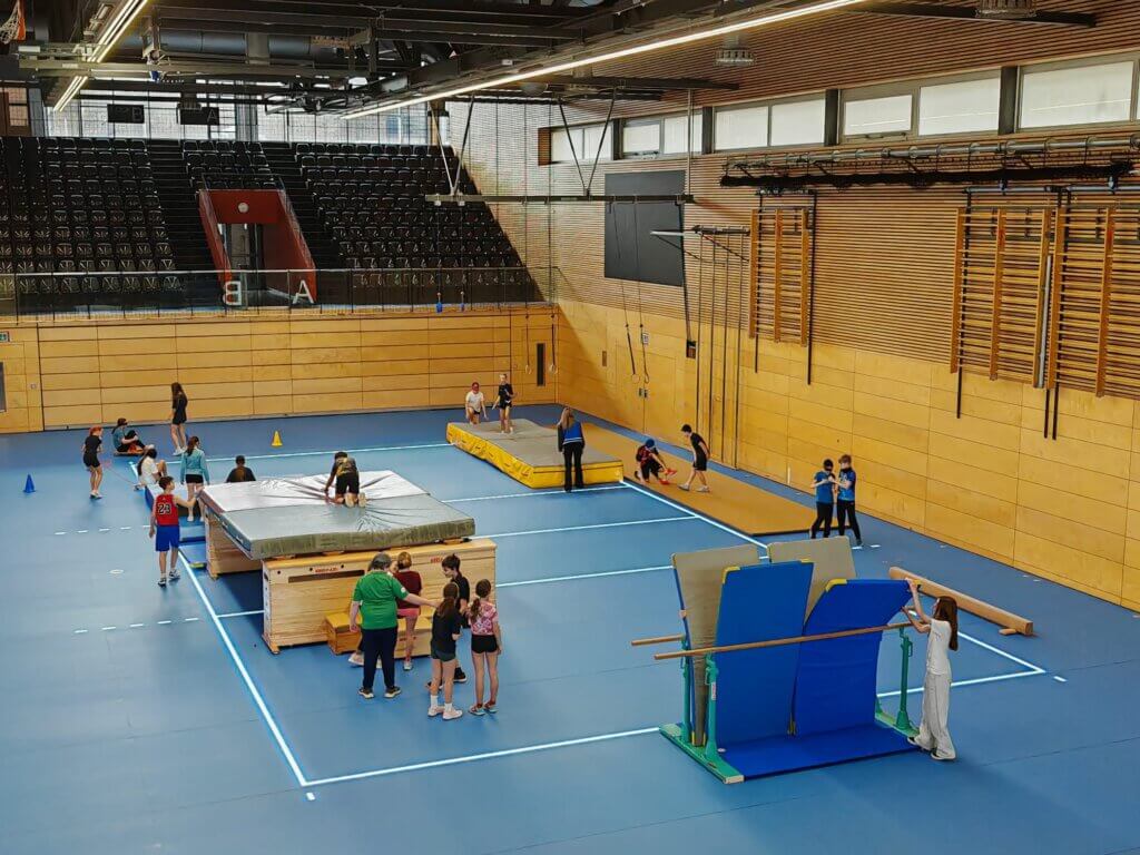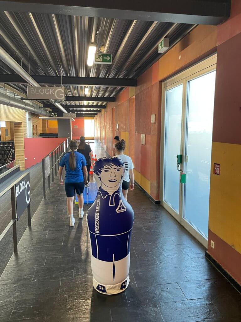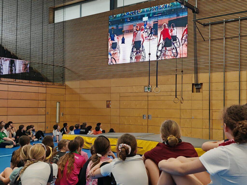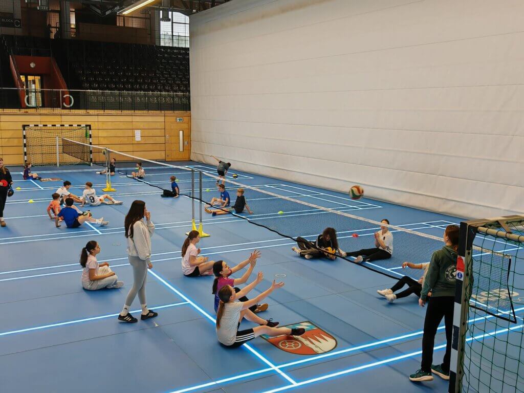 Als Erstes begannen die 6. Klassen in der Sporthalle mit ihren Aktivitäten. Die 8. Klassen starteten dann um 10.25 Uhr und beendeten den Inklusionstag pünktlich um 12.55 Uhr. Neben Rollstuhlbasketball konnten die Teilnehmenden die inklusiven Sportarten Sitzvolleyball und Goalball ausprobieren. In einer weiteren Halle war eine Gerätelandschaft aufgebaut, die blind bewältigt werden musste. Teamwork und Vertrauen waren hier gefragt, denn der Parcour (Klettern, Balancieren, Rollbrettfahren…) konnte allein nicht bezwungen werden. Mit Blindenstöcken ausgestattet erprobten die Schülerinnen und Schüler bei der fünften Station, einem Orientierungslauf entlang der Tribünen, durch das Foyer, bis in die Zuschauerränge, wie sehbehindertengerecht das Gebäude aufgebaut ist. Dabei stießen sie durchaus auf das ein oder andere Hindernis.