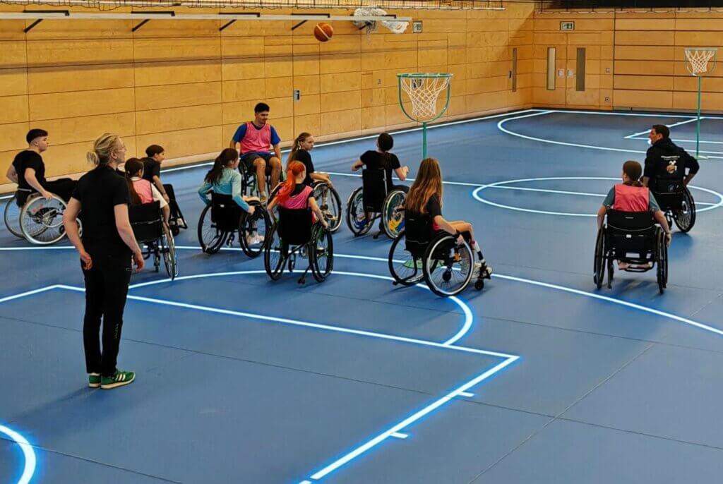 Am Donnerstag, dem 26. Februar, fand am Julius-Echter-Gymnasium zum zweiten Mal eine besondere Sportveranstaltung statt, nämlich ein Inklusionssporttag für die 6. und 8. Klassen mit fünf verschiedenen Stationen. Außerdem war der Bayerische Behindertensportverband (BVS) mit zwei Referenten, Klaus Gläser und Romy Pawellek vor Ort, die mit den Schülerinnen und Schülern Rollstuhlbasketball spielten und sie für diese inklusive Sportart gewinnen konnten. Vielfach wurde danach die Bitte an die Sportlehrkräfte gerichtet, ob man nicht zukünftig wieder einmal Rollstuhlbasketball spielen könnte. Wir bleiben am (Basket-)Ball und versuchen auch weitere Kooperationen außerhalb des speziellen Tags zu ermöglichen!