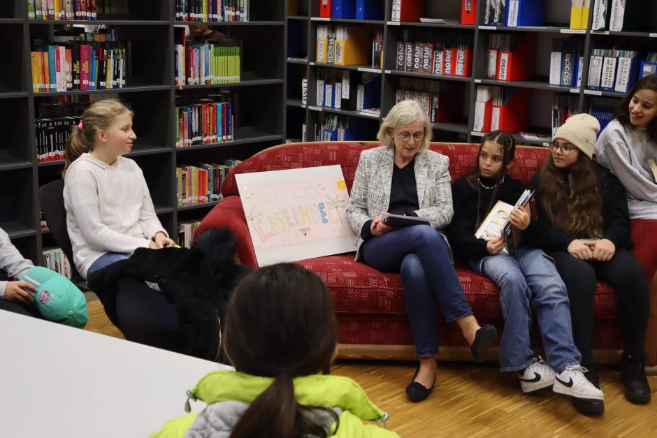 Aber nicht nur mit dem literarischen Stundeneinstieg wurde für das Lesen geworben: Einige Lehrkräfte waren auch in der Bücherei, der Mensa und – sehr zur Freude der Schülerinnen und Schüler der Q 11 – auch in ihrem Kollegstufenzimmer als „lebende Bücher“ bzw. „Leseinseln“ im Einsatz. So lauschten in der ersten Pause einige Schülerinnen aus der Unterstufe aufmerksam Schulleiterin Petra Hein, die nicht nur vortrug, sondern sich auch gleich noch mittels Nachfragen vergewisserte, ob das Gelesene auch richtig verstanden wurde. Eine etwas andere Erfahrung machte Susanne Ingenbleek in der Mensa, in der sich die anwesende Schülerschaft wohl eher weniger auf das Zuhören, sondern mehr auf das begleitende Herumblödeln konzentrierte. Schade!