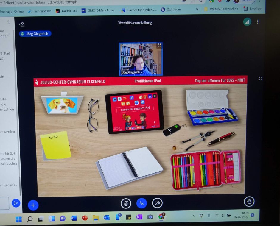 Der Informationsabend startete dann um 17 Uhr auf der selbst gehosteten Konferenzplattform „BigBlueButton“, mit dem einführenden Vortrag von Schulleiterin Petra Hein, zu dem sich über 100 Interessierte zugeschaltet hatten. In knapp 40 Minuten stellte sie sowohl die gymnasiale Schullaufbahn allgemein als auch speziell das neusprachliche und sozialwissenschaftliche Gymnasium vor. Natürlich blieben dabei die Vorzüge des JEGs nicht unerwähnt: So war Lehrer Bernd Gehrung für Erläuterungen zur Sportklasse zugeschaltet. Petra Hein war es aber wichtig, die Schulwahl an sich zu thematisieren und den Eltern die Angst vor den vermeintlich zu hohen Ansprüchen des Gymnasiums zu nehmen: „Vertrauen sie den Einschätzungen ihrer Grundschullehrer, wenn sie ihrem Kind die Empfehlung ans Gymnasium aussprechen.“