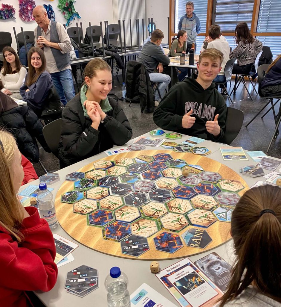 Höhepunkt war dann das Simulationsspiel „Mach mit beim Green Deal“, welches vom Theaterpädagogischen Zentrum des Jungen Theaters Augsburg extra für den Workshop entwickelt worden war: Die Klassen wurden dafür in Kleingruppen von sechs Schülerinnen bzw. Schülern aufgeteilt. Diese schlüpften dann in die ihnen zugeteilten Rollen. Mit dem Spiel nahmen die Jugendlichen unterschiedliche Perspektiven ein, mussten beispielsweise für den Lebensraum Stadt gemeinsam neue Lösungen für ein klimafreundliches Miteinander des Menschen mit seiner Umwelt entwickeln.