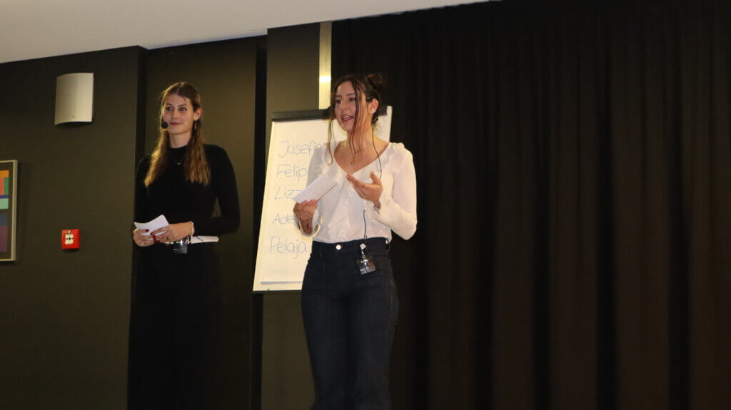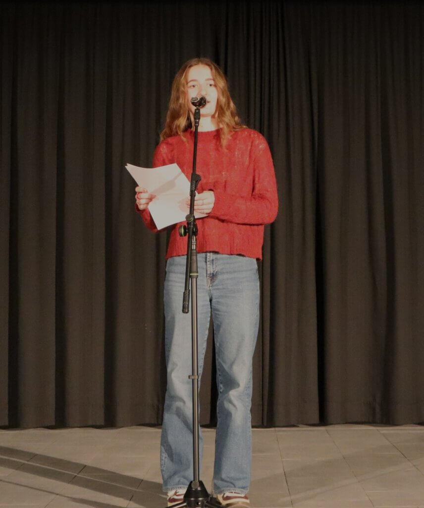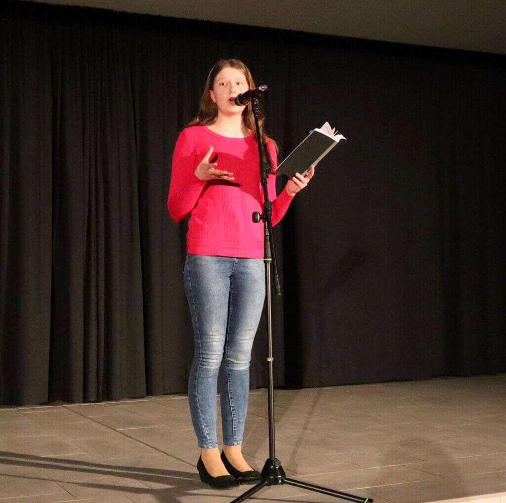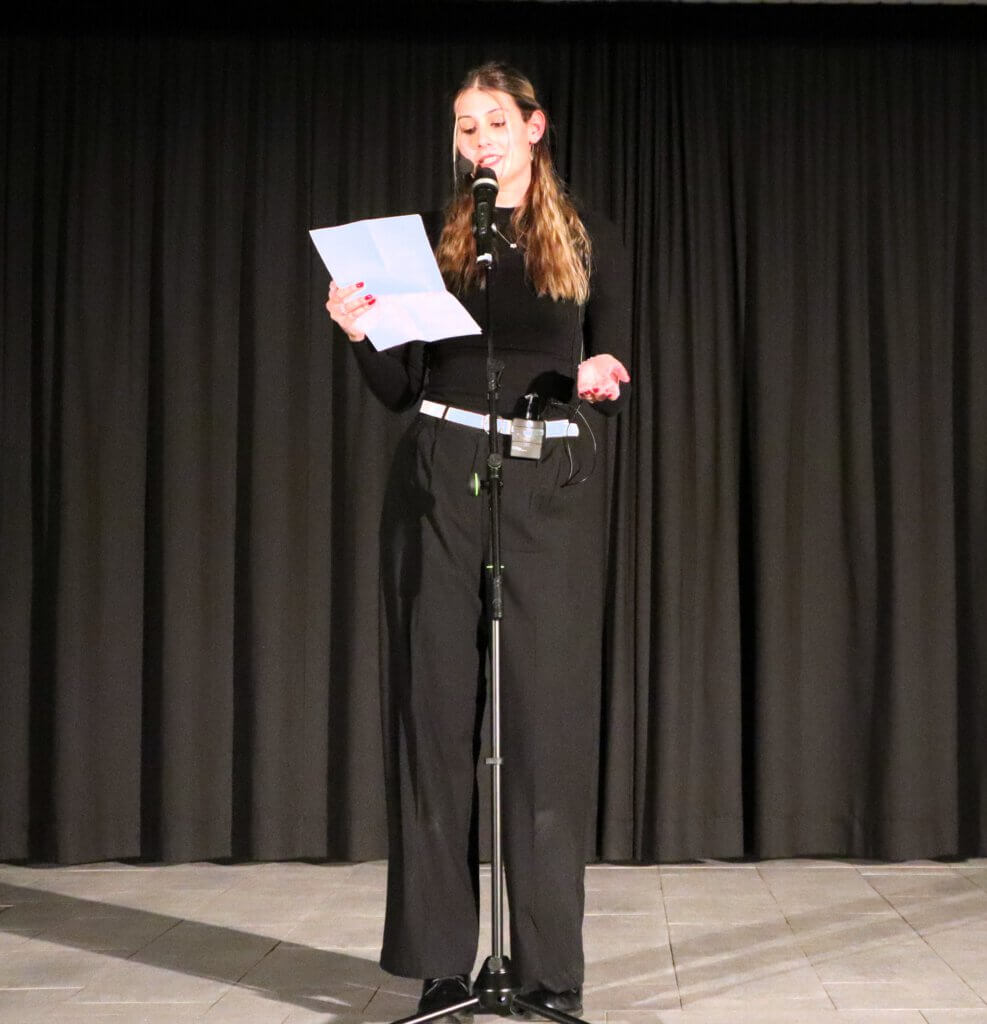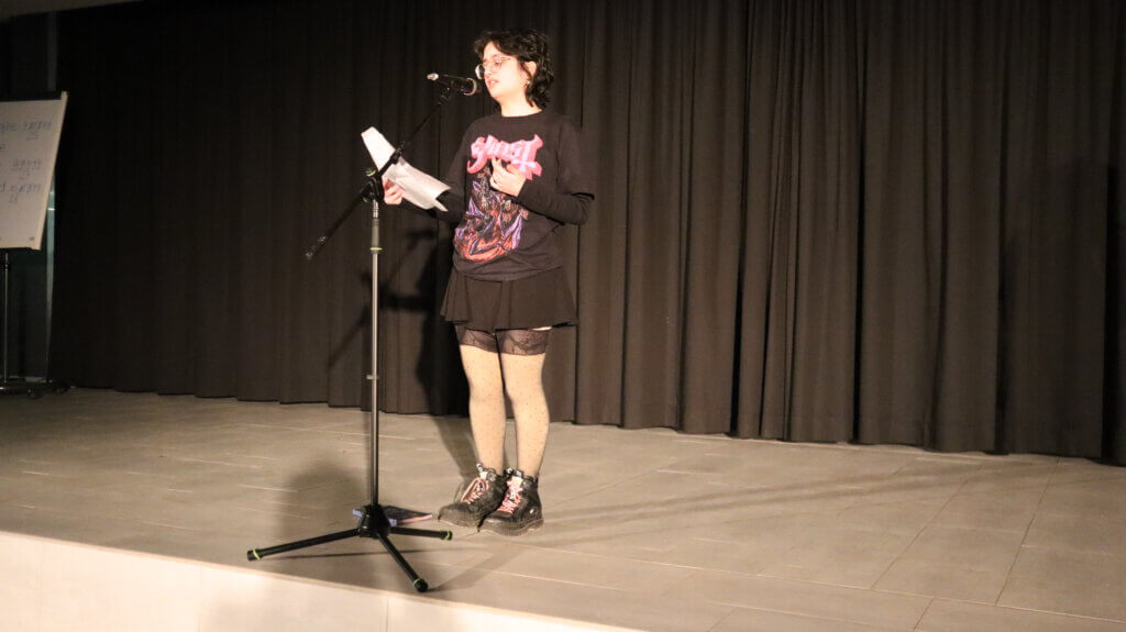 Zum Einstieg trug Lea Bachmann einen eigenen Slam mit dem Titel „Zwischen Pixeln und Erinnerungen“ vor. Dabei machte sie sich Gedanken um das Vergehen der Zeit und was am Ende von all den vielen Momentaufnahmen, die man auf dem Handy gespeichert hat, wirklich in Erinnerung bleibt. Josephine Verführt, die im letzten Jahr den Poetry Slam am JEG ins Leben gerufen hat, ist extra aus Trier angereist. Ihrem Beitrag „Ich hasse mich“ merkte man die Entstehungszeit während des Corona-Lockdowns an, denn die Beschäftigung mit vermeintlichen Unzulänglichkeiten rund um die eigene Körperlichkeit passte nur zu gut in diesen Zeitraum erzwungener Bewegungslosigkeit. Zum ersten Mal dabei ist Lizzy Fischermann vom JEG. Zur Freude aller Deutschlehrer bekannte sie, auf die Idee zu ihrem Text durch die Lektüre das Dramas „Faust“ gekommen zu sein. Ihr Text kreiste denn auch um existentielle Sorgen und Nöte, metaphorisch eingekleidet u. a. in eine Variation des Mythos von Narziss. Adelheid Stauder vom Miltenberger Butzbach-Gymnasium hatte sich in ihrem Slam vorgenommen, all den tollen Menschen zu danken, denen sie vielleicht noch ein Dankeschön schuldig ist. Ihr temporeicher Text war sicherlich einer der Höhepunkte des Abends. Zuletzt betrat Pelaja Aucello aus Aschaffenburg die Bühne, im Gepäck gleich zwei Texte, zwischen denen das Publikum wählen durfte. Der gekürte Beitrag hatte es in sich: An die Adresse der Erwachsenen gerichtet rechnete Pelaja schonungslos mit aktuellen politischen Fehlentwicklungen, insbesondere dem Erstarken autoritärer Bewegungen, ab. Mit einem Appell für Toleranz, Gleichheit und für den Respekt vor den Menschenrechten einer jeden Person endete dieser politischste Beitrag des Abends.